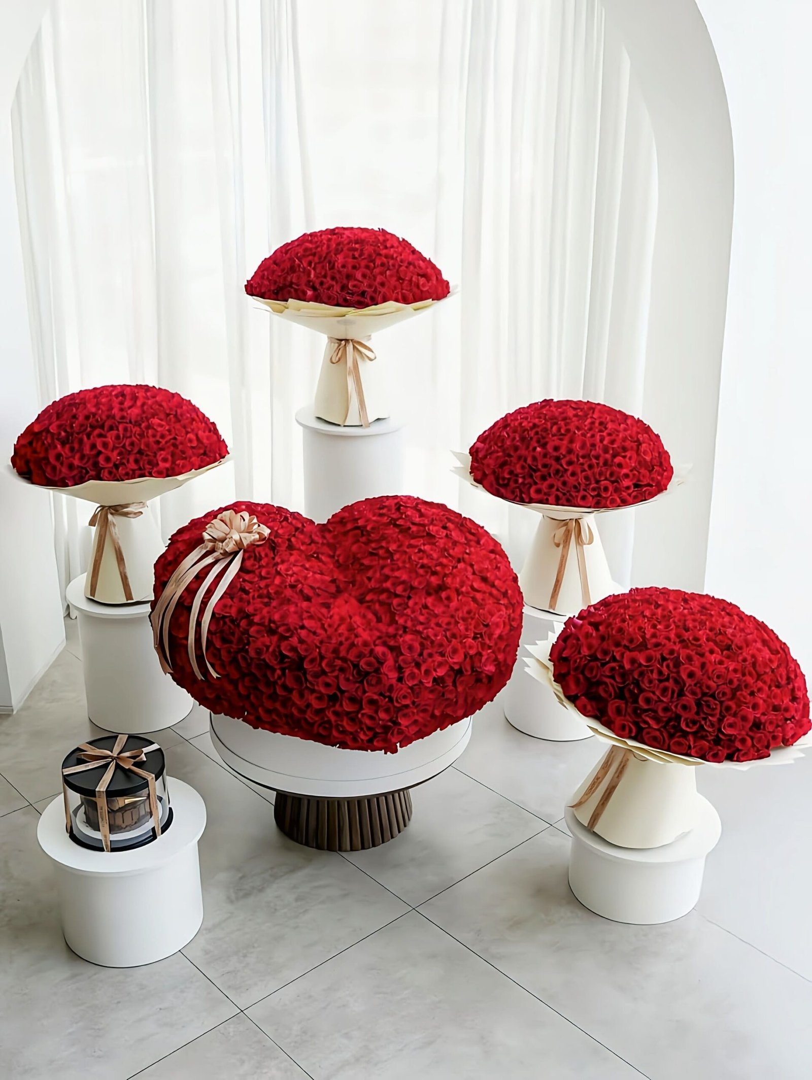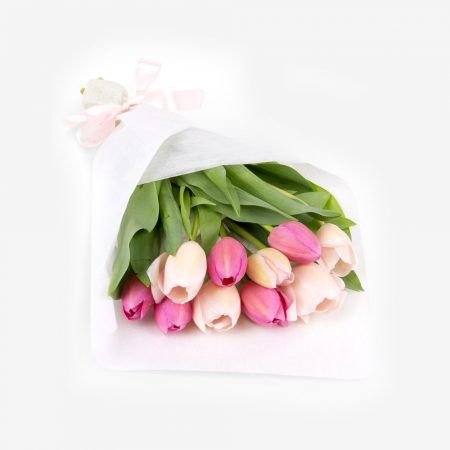 A stylish basket of fresh blooms and delicate presentation.